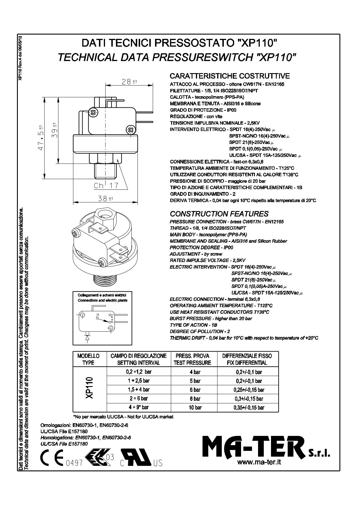 Produktinformationen "Druckschalter Mater XP110 2-6 bar einstellbar, Voreinstellung 4 bar "